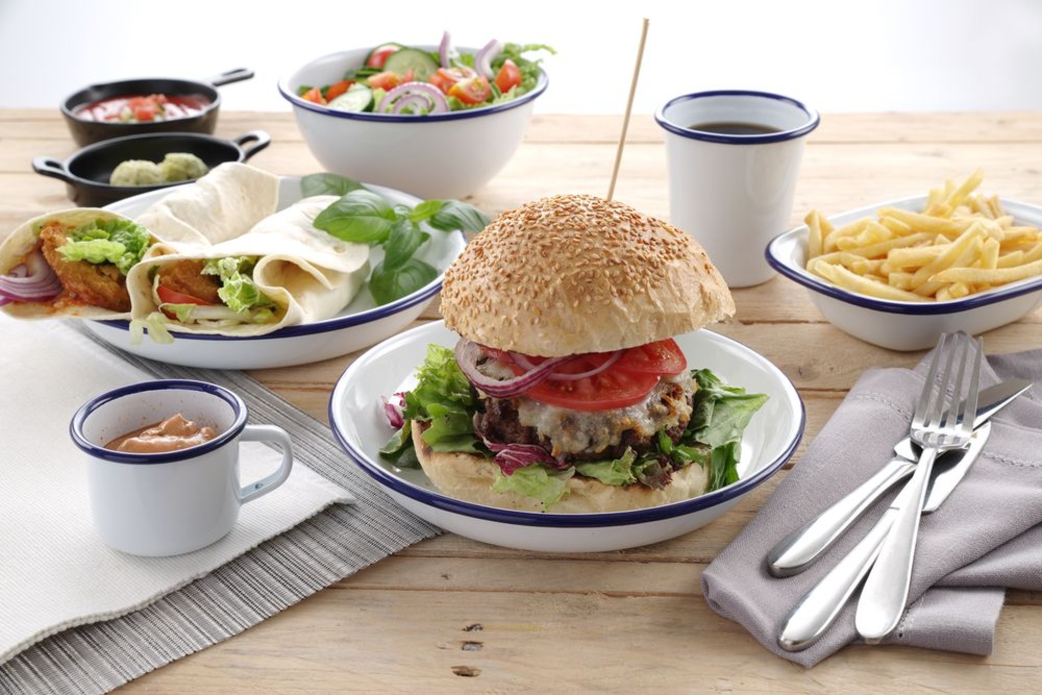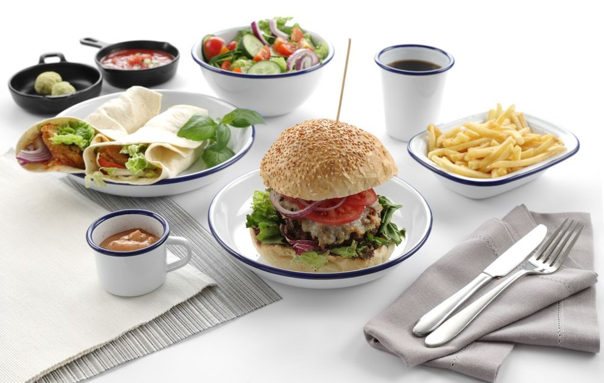 Gemaakt van staal, geëmailleerd in wit met een blauwe rand.