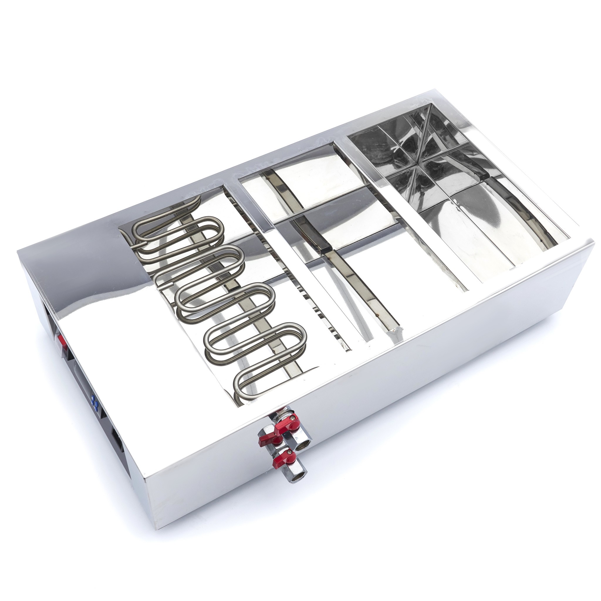 Deze roestvrijstalen chocoladesmelter is uitgerust met 3 stuks 1/3 GN bakken en bijbehorende deksels. Hij heeft 4 rubberen poten, waardoor hij stevig op het oppervlak blijft staan. Het display is eenvoudig te bedienen en bestaat uit een aan-/uitknop en een digitale temperatuurregelaar. Met de pijltjestoetsen kun je de gewenste temperatuur instellen en op het digitale display kun je de voortgang van de het verwarmen van het apparaat goed in de gaten houden. De temperatuur is per enkele graad instelbaar van 3 tot 100°C. De chocoladesmelter is voorzien van een tapkraan, hiermee kun je de chocoladesmelter makkelijk leeg laten lopen. Ook heeft de chocoladesmelter een stoomafvoerklep. De stoom die ontstaat door het verwarmen van het water, kan zo eenvoudig weggevoerd worden uit het apparaat.