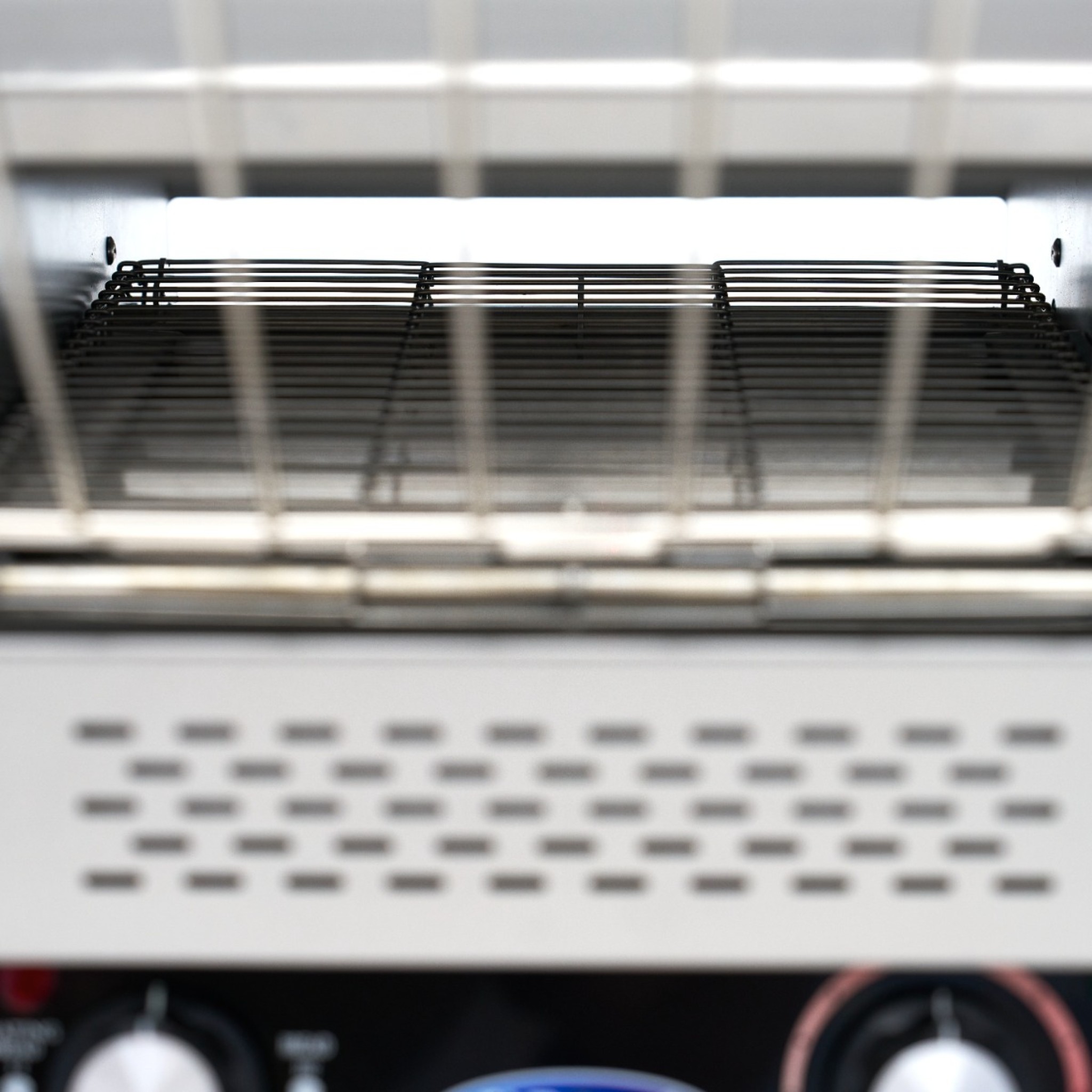 Met de tweede knop stel je de snelheid van de transportband in om de bruining naar wens aan te passen. De snelheid is instelbaar van 1 tot 9 omwentelingen per minuut.
