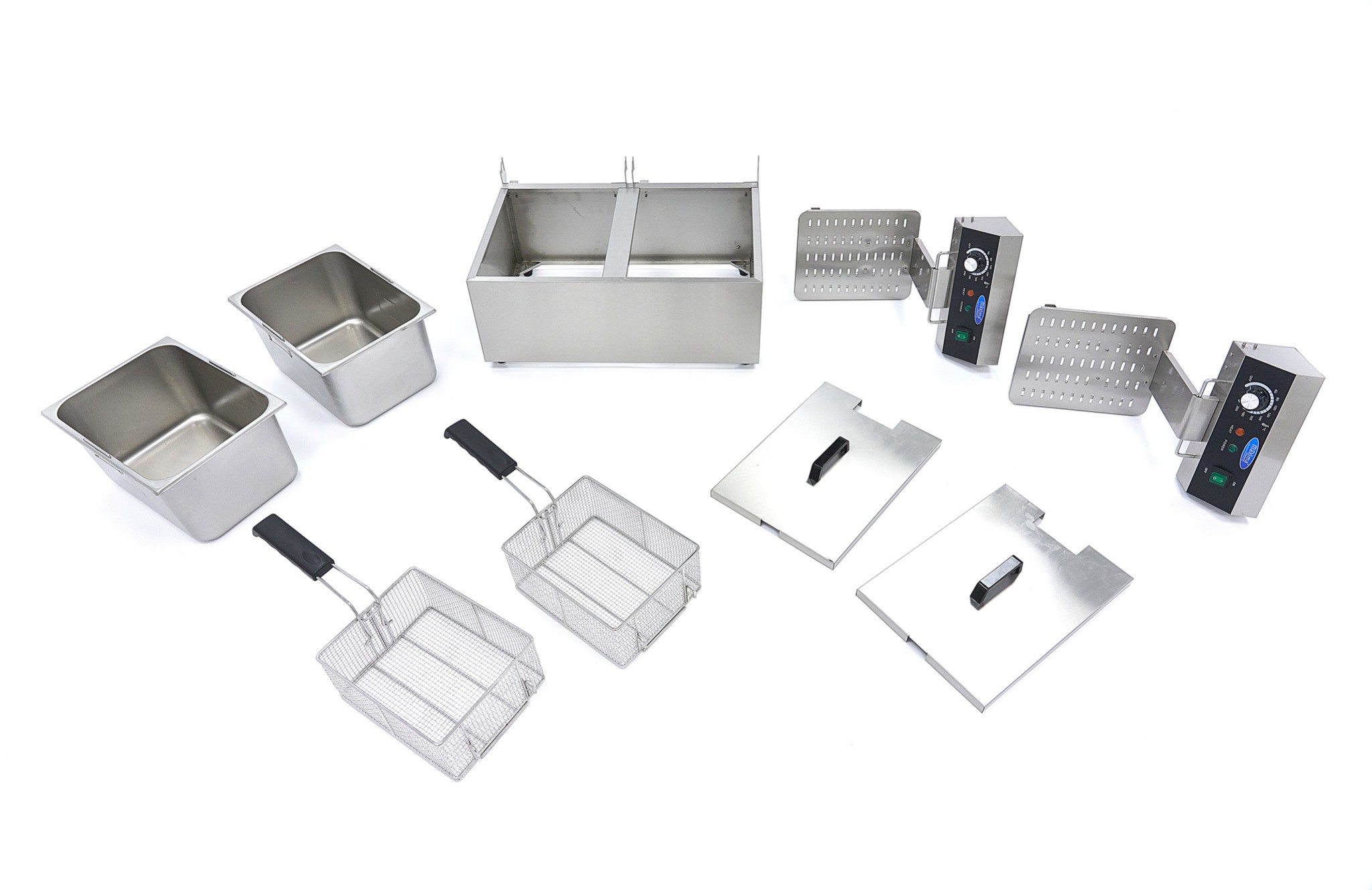Deze frituurpan is volledig vervaardigd uit roestvrij staal, wat hem stevig, duurzaam en eenvoudig te reinigen maakt. De frituurmanden hebben hittebestendige handgrepen en rusten stabiel in de frituurbakken. Elke kant is individueel te bedienen, waardoor je flexibel werkt en verschillende producten tegelijk kunt frituren. Antislipvoetjes zorgen voor extra stabiliteit tijdens gebruik.