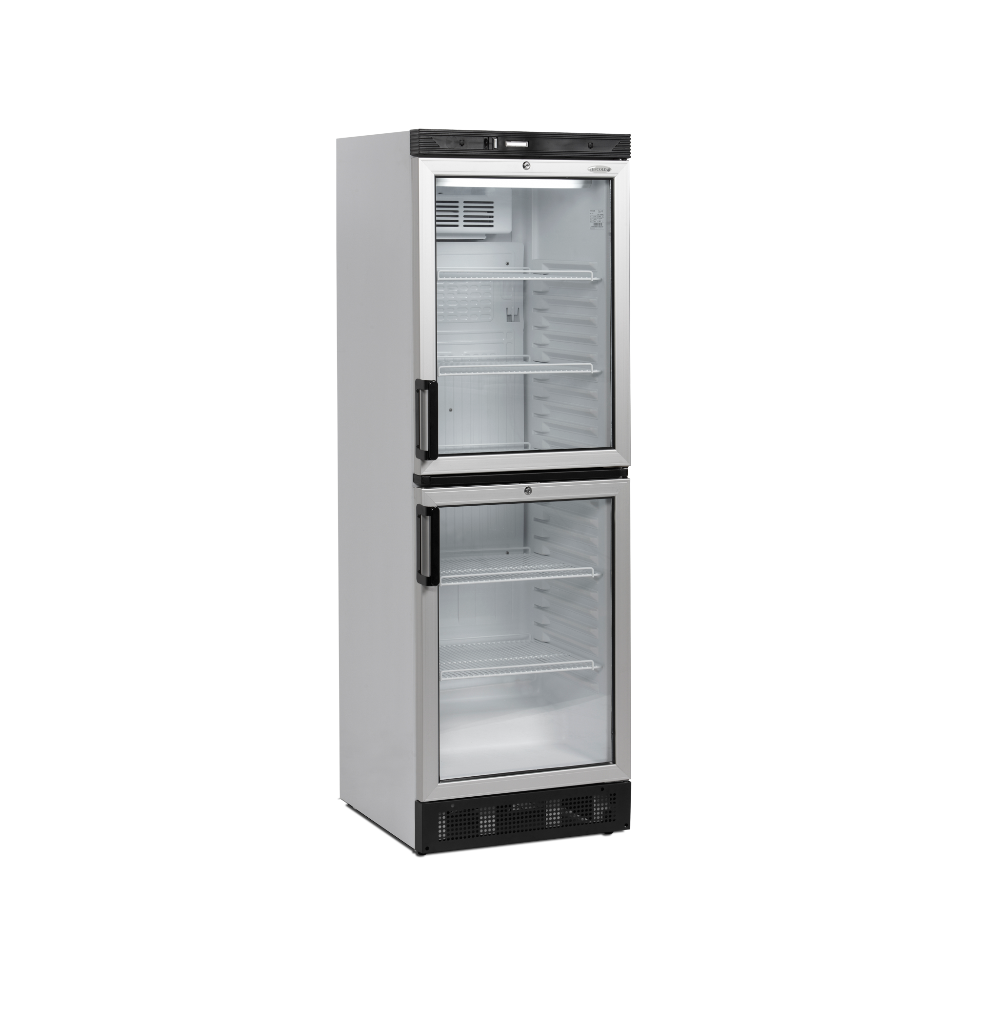 De FS-serie flessenkoelers biedt een uitstekende ontwerpkwaliteit tegen een concurrerende prijs. De kast is wit met twee grijze glazen deuren met aluminium frame. Dit zorgt voor een geweldige productpresentatie in combinatie met een krachtig door ventilator ondersteund koelsysteem, en de verstelbare planken zorgen voor extra flexibiliteit. Veel modellen zijn ook verkrijgbaar met kap (FSC-serie). Kenmerken: Glazen scharnierdeuren met aluframe • Omkeerbare deuren • Instelbare planken • Instelbare voet • LED-binnenverlichting • Ventilatorkoeling