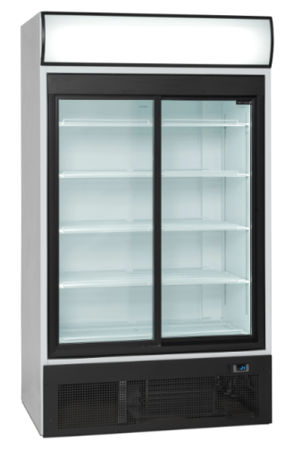 2-deurs displaykoeler met kap De FSC-serie displaykoelers met 2 of 3 deuren met een verlichte kap biedt een uitstekende ontwerpkwaliteit tegen een concurrerende prijs. Kies tussen kasten met witte of zwarte buitenzijde met zwarte glazen deuren met aluminium frame – scharnierend of schuivend. De planken zijn verstelbaar, waardoor de FSC-serie een flexibele oplossing is. Dit zorgt voor een geweldige productpresentatie in combinatie met een krachtig geventileerd koelsysteem dat wordt geregeld door een elektronische thermostaat. Veel modellen zijn ook verkrijgbaar zonder kap (FS-serie). Kenmerken: Zelfsluitende glazen schuifdeuren • Verlichte kap • Interne verticale verlichting • Instelbare planken • Instelbare voet • Geventileerde koeling