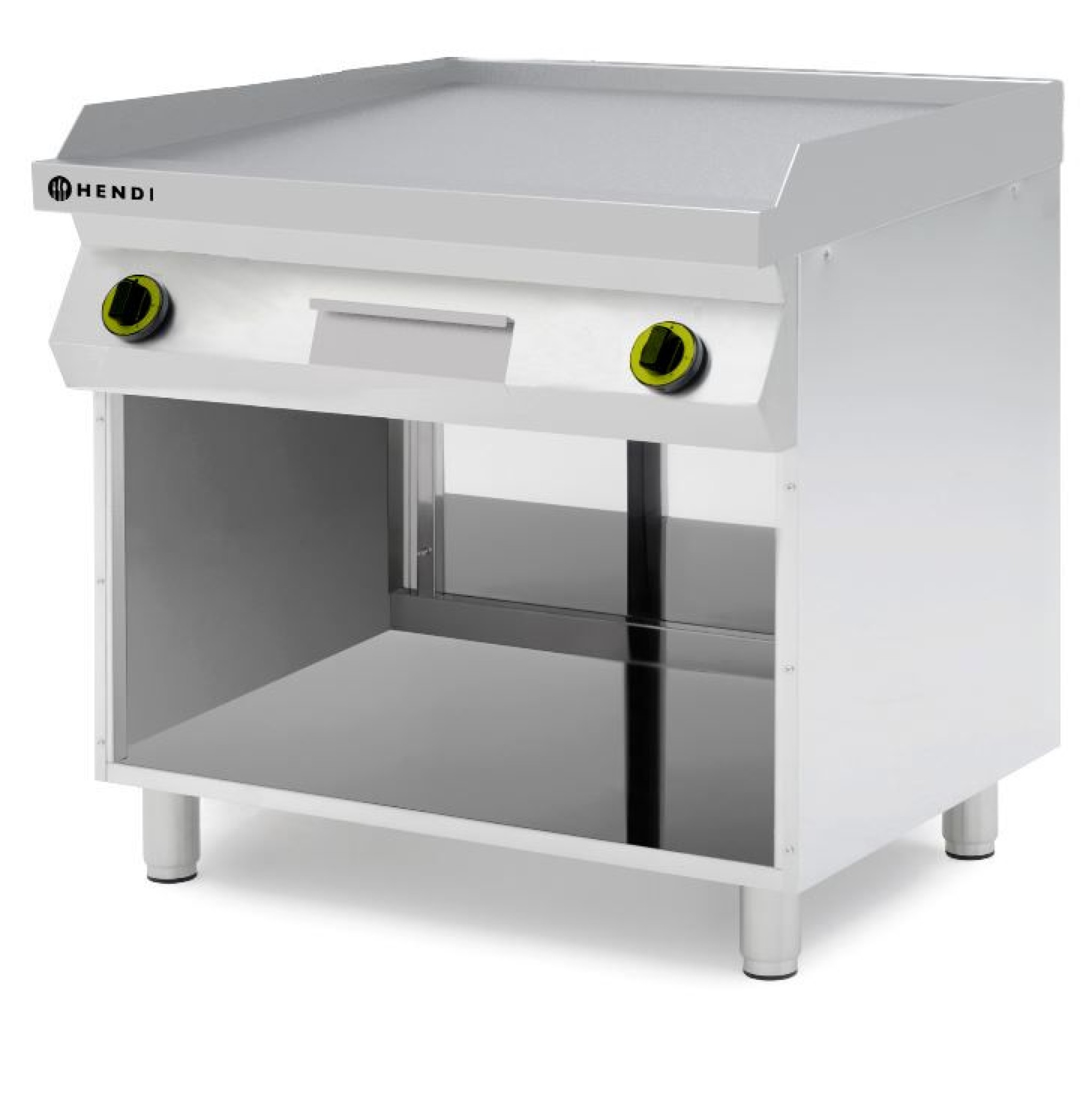 +31 (0)226 411 540Hendi | Gladde gasgrillplaat gemonteerd op een onderkast, gesloten aan drie zijden