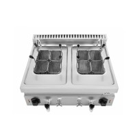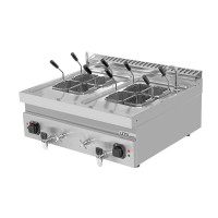 Compacte elektrische pastakoker voor op het aanrecht met een inhoud van 2 x 12 liter, ontworpen voor snel en efficiënt koken in professionele keukens. Uitgerust met een AISI 304 roestvrijstalen tank, instelbare temperatuur tot 110 °C, veiligheidsthermostaat, waterkraan en aftapkraan aan de voorzijde voor eenvoudige bediening en reiniging.
