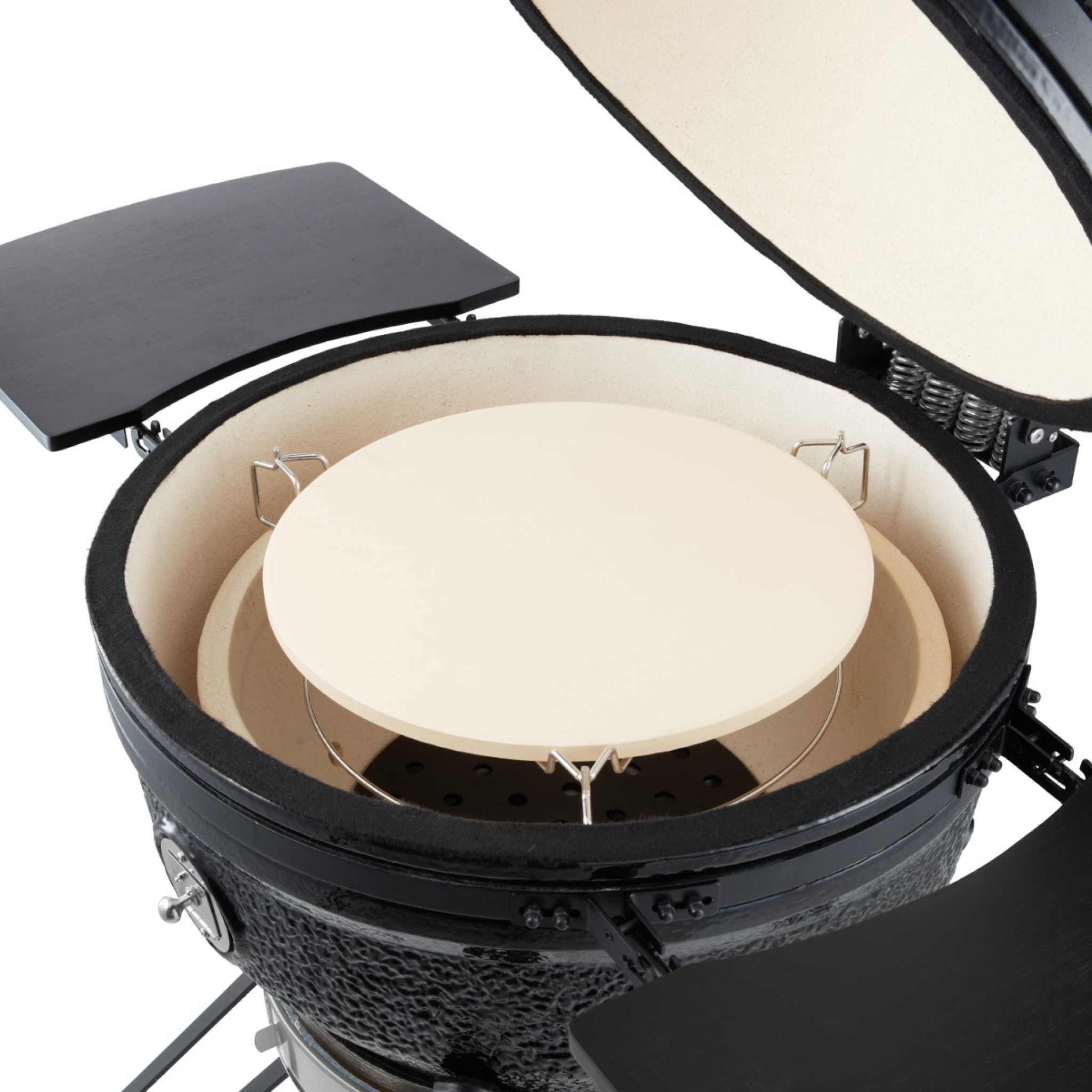 Dankzij de robuuste materiaalkeuze kun je hem veilig buiten laten staan. De stalen onderdelen zijn gepoedercoat en de wanden zijn gemaakt van keramiek. Het grote voordeel van een keramische barbecue is natuurlijk dat hij bestand is tegen hoge temperaturen. Een andere eigenschap van keramiek is dat het de warmte heel goed vasthoudt. Hierdoor kun je de temperatuur mooi constant houden. Grillen, roken, bakken en stomen wordt zo voor iedere kok een fluitje van een cent.