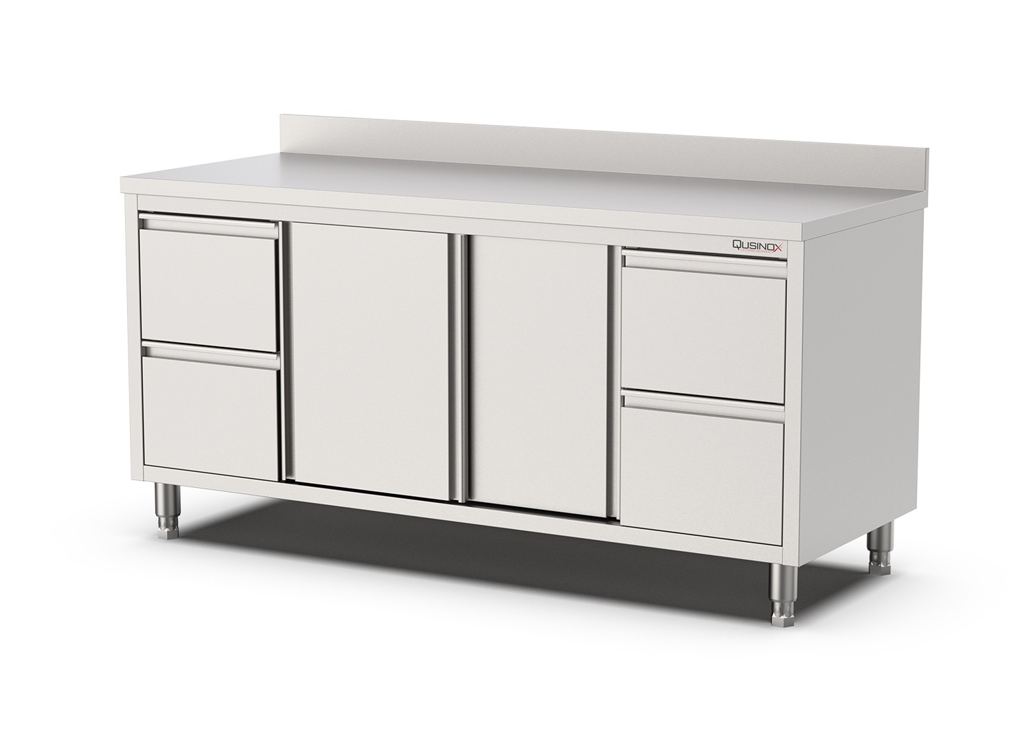 +31 (0)226 411 540Qusinox | Schuifdeur werkbank met 2+2 laden L+R Met opstaande rand 2000x600x900mm