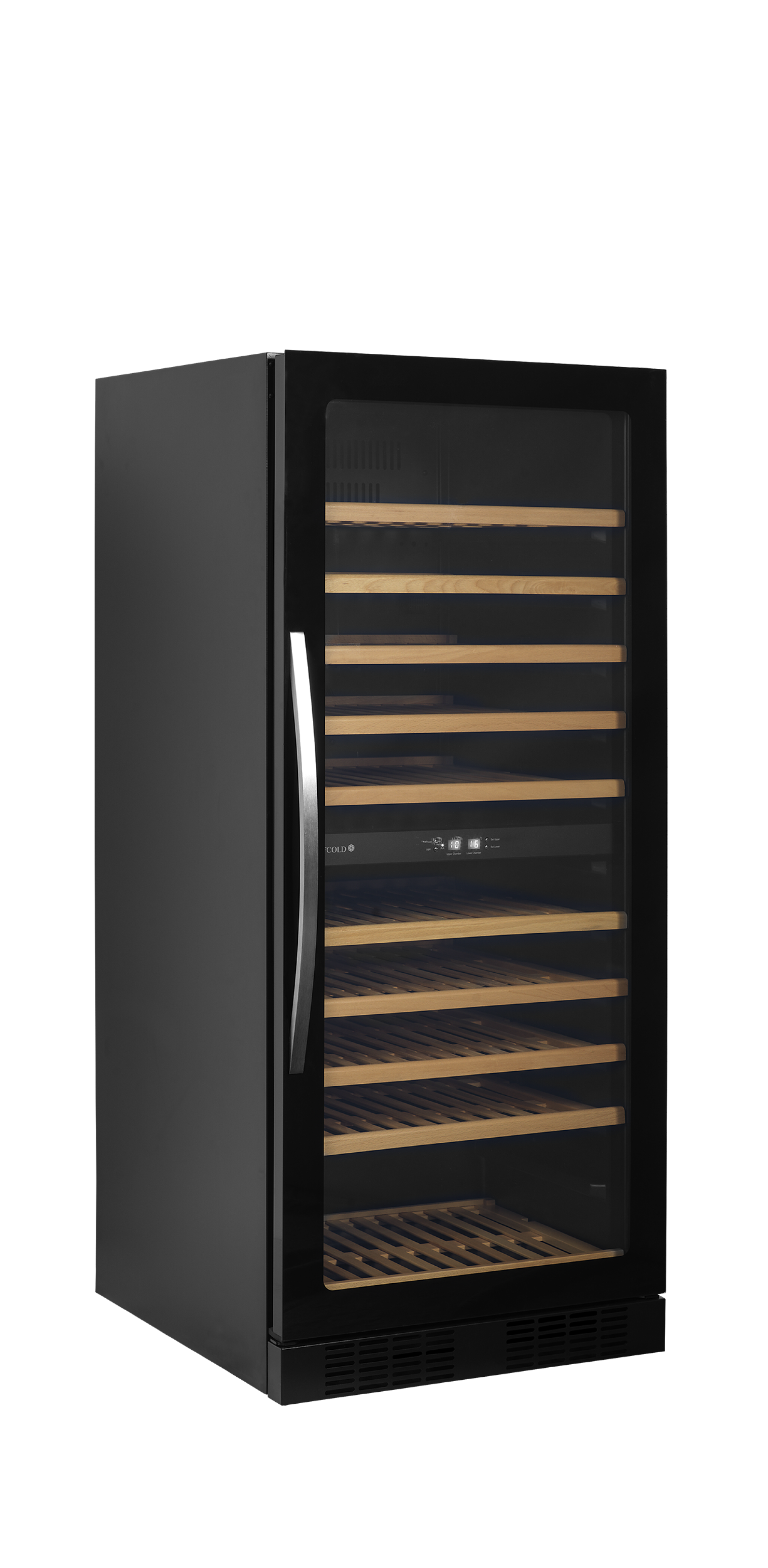 Zwarte wijnkoeler met glazen deur voor exclusieve presentatie De TFW-F serie frameloze wijnkoelers biedt een elegante oplossing voor het bewaren en presenteren van wijn. Met een eigentijds ontwerp met een glazen deur van rand tot rand, zachte ledverlichting en uitschuifbare houten planken. De wijnkoeler beschikt ook over een modern koelsysteem dat zorgt voor minder warmte, minder geluid en een lager energieverbruik van de kast. Kenmerken: Randloze glazen deur • 2 temperatuurzones met max. 10°C verschil • Energiezuinig koelsysteem • Zeer laag geluidsniveau • LED-binnenverlichting met schakelaar • Omkeerbare deur • Gebogen greep van roestvrijstaal • Houten planken • Presentatieplanken als optie verkrijgbaar • Alarm bij te hoge/lage temperatuur