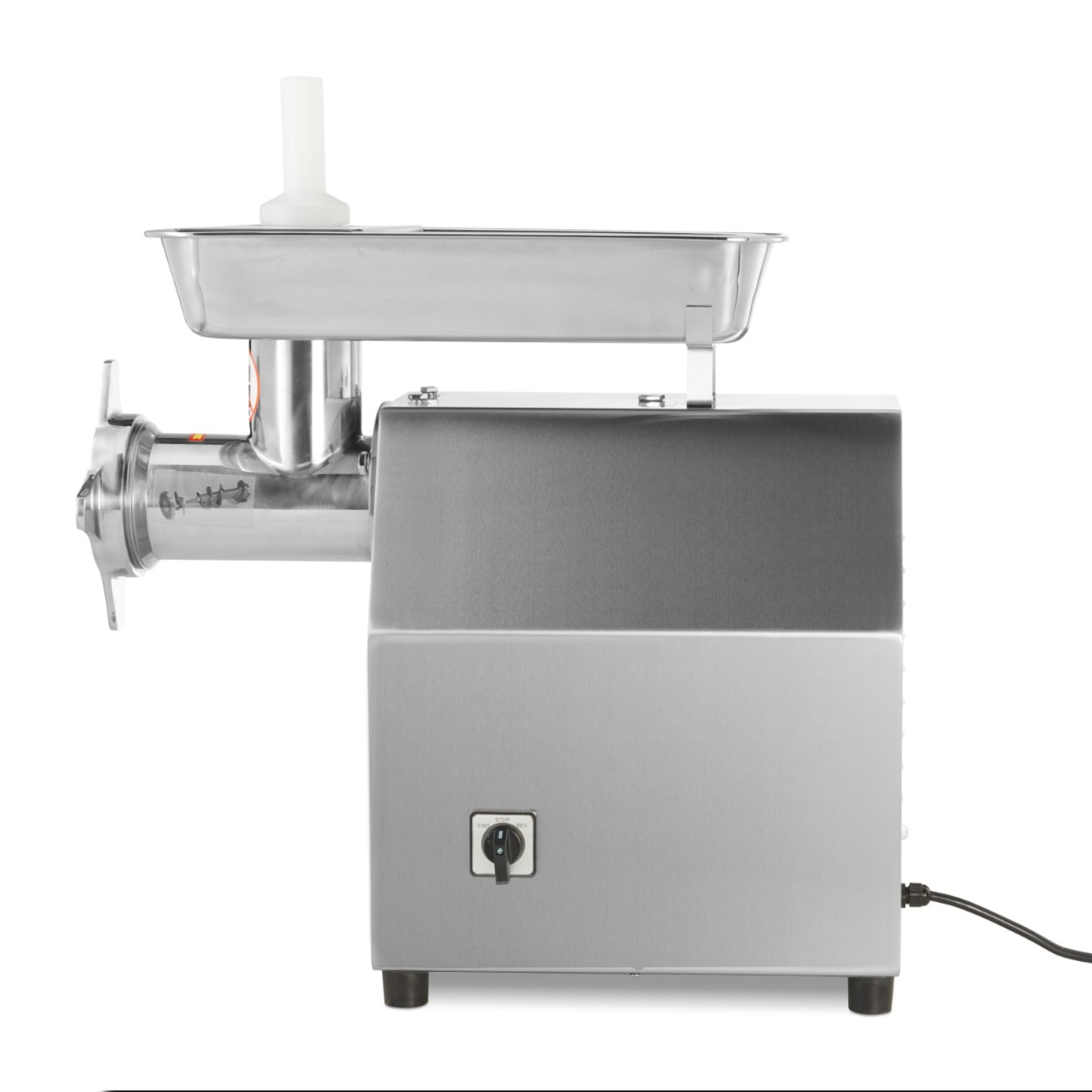Verschillende onderdelen van deze vleesmolen zijn gemaakt van RVS zoals de behuizing, schaal, worm en de schroefring. De messen en gatenschijven zijn gemaakt van gehard staal. Standaard worden de volgende accessoires geleverd bij deze vleesmolen: een worstenvuller van Ø 20 mm, een voedseldoordrukker, twee kruismessen en twee gatenschijven van 6 mm en 8 mm. Je kunt niet alleen vlees malen in de stand vooruit, ook is het mogelijk om vlees achteruit te malen. Verder is de vleesmolen zeer makkelijk te bedienen. Je zet de juiste gatenschijf erin en zet het apparaat aan. Met de stopper schuif je het vlees richting de messen en gatenschijven. Wanneer het vlees gemalen is vang je alles op in een bak of schaal.