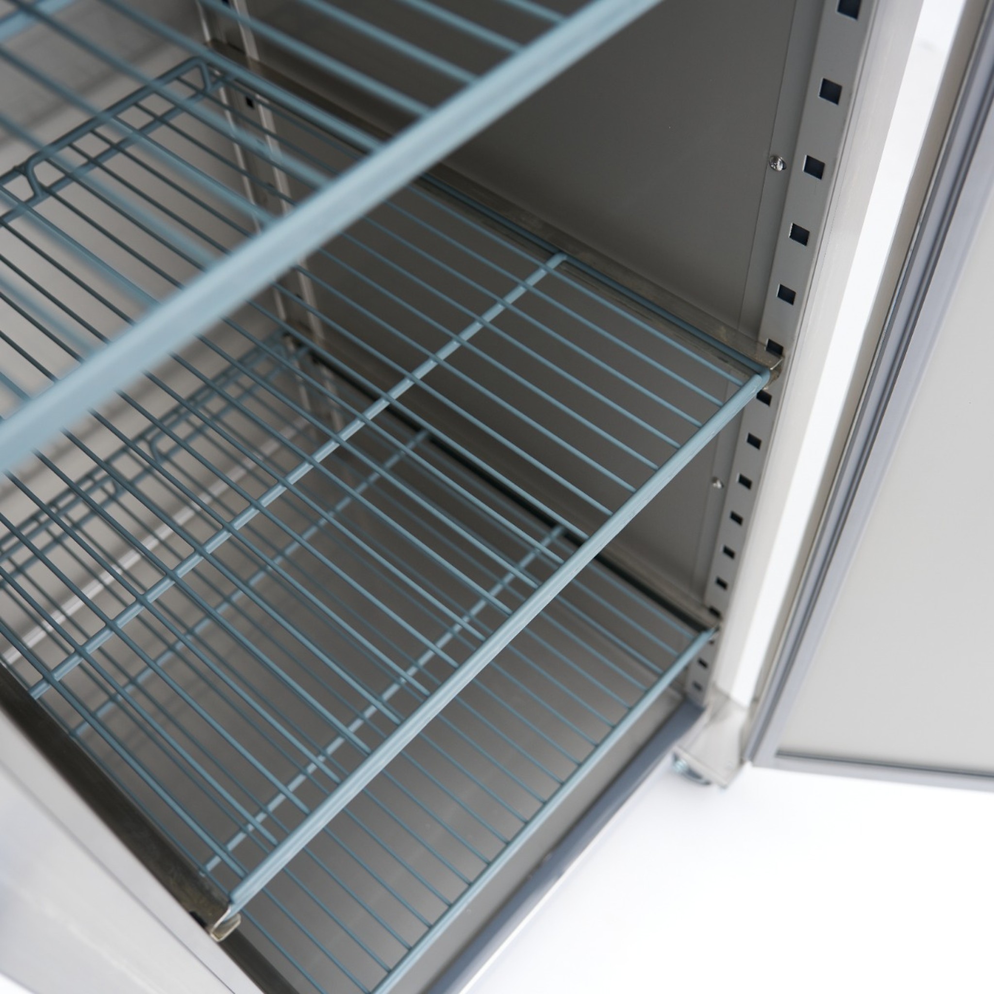 Deze vrieskast beschikt over drie verstelbare roosters van 53 x 55 cm, geschikt voor 1/1 GN-bakken. De zelfsluitende deur is voorzien van een verwarmde, antibacteriële rubberen afdichting en een slot met twee sleutels voor extra veiligheid. Dankzij de vier wielen, waarvan twee met rem, verplaats je de vrieskast eenvoudig en zet je hem stevig op zijn plaats. De energiezuinige LED-verlichting zorgt voor uitstekend zicht op de inhoud, ook in donkere omgevingen.