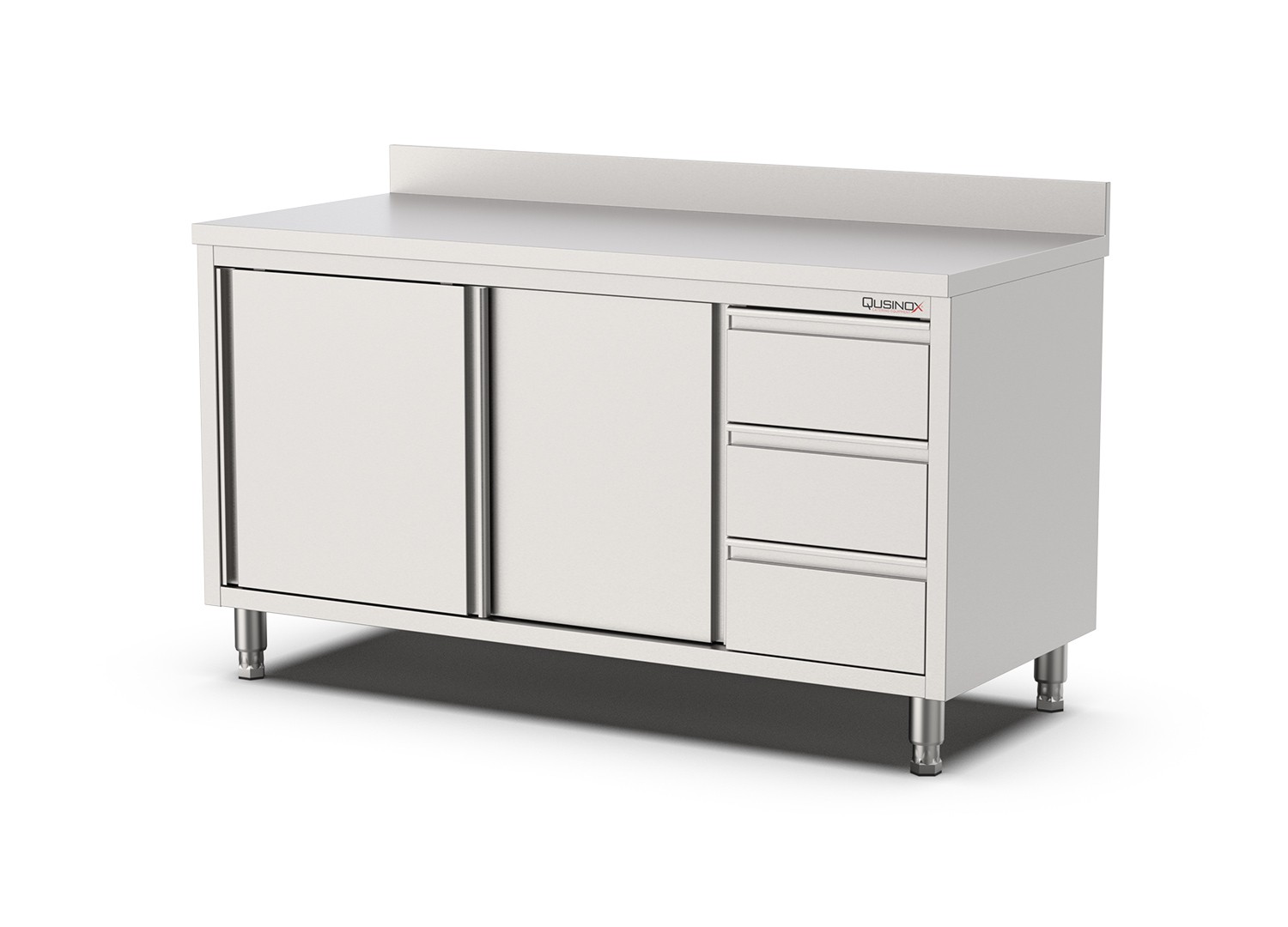 Deze professionele werktafel met schuifdeuren en laden van Qusinox is opgebouwd uit stevige constructie.